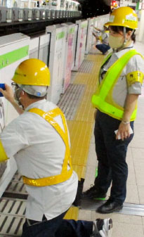 車内・駅どちらの広告掲出作業においても、安全確保を徹底するために毎年現車訓練を行います。実際の車両を使用して、車両や駅の危険を自覚し、運転・傷害事故「ゼロ」を目指します。